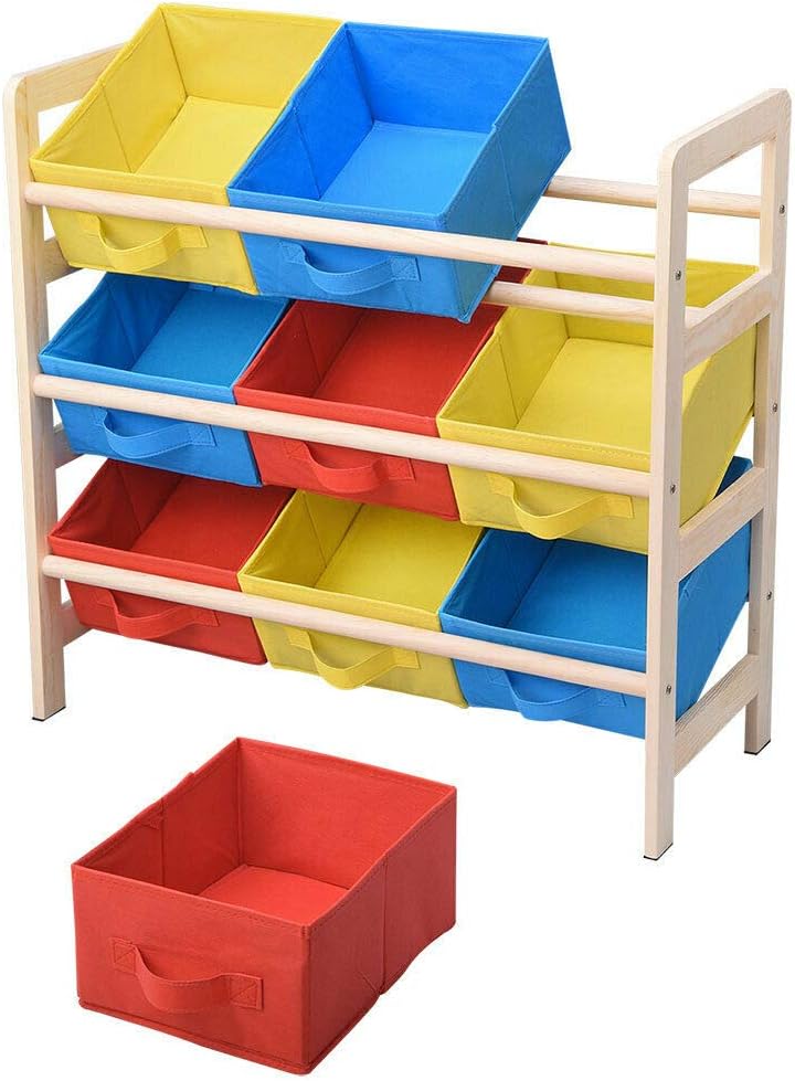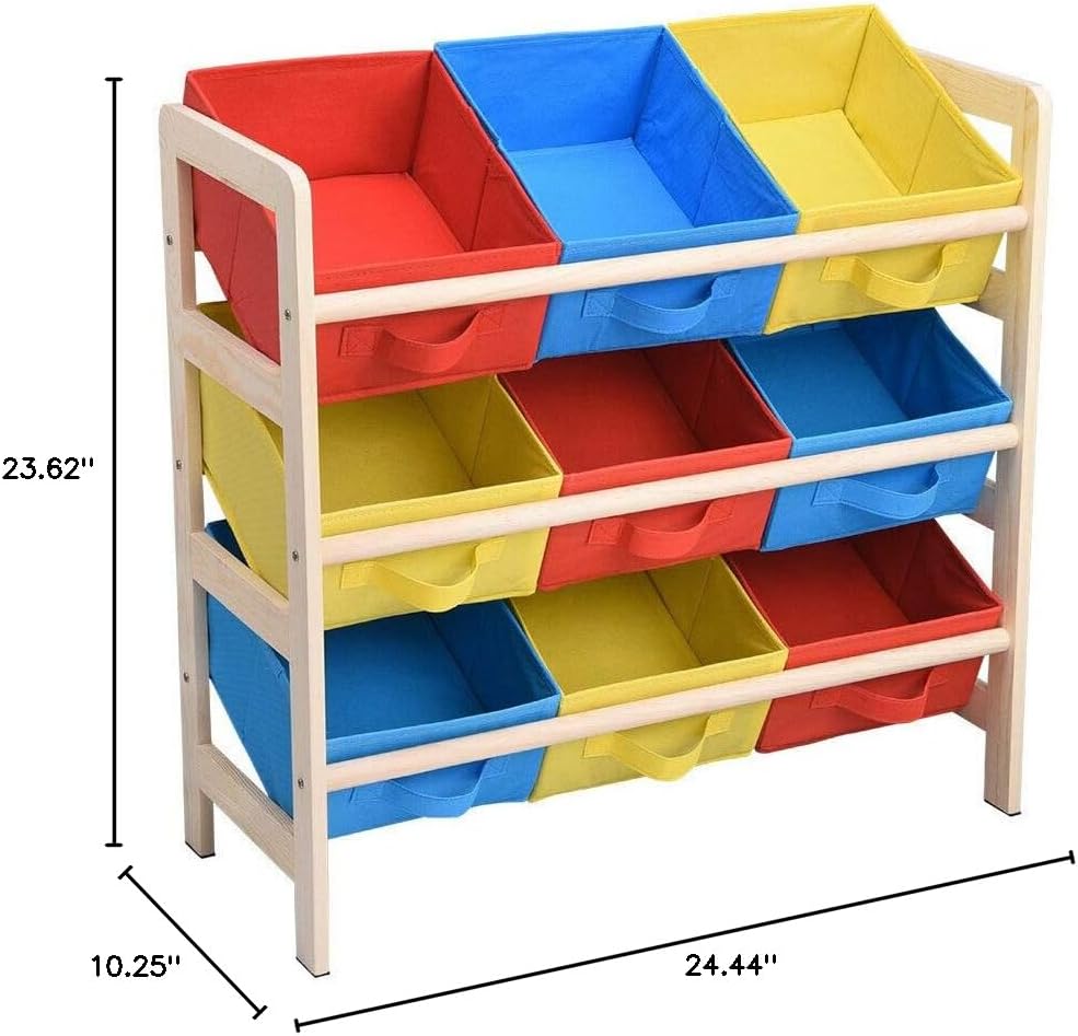 Athena Supply Company PRE SALE Kids Toy Organizer Storage Box Wood Frame Shelf Rack Playroom Bedroom Features: Colorful bins allow kids to store toys by different categories, helping to develop organization ability 2 side handles for easy moving Specifications: Overall Dimension(LxWxH): 24 7/16" x 10 1/4" x 23 5/8" (62 x 26 x 60 cm) Storage Bin Dimension (LxWxH): 8 1/16" x 10 7/16" x 4 3/4" (20.5 x 26.5 x 12 cm) Max Capacity (Each Tier): 4.4 lbs (2 kg) Net weight: 6 lbs (2.8 kg) Material: Pine, Nonwoven Fabric Package Contents: 2x Side Boards 9x Storage Bins 12x Screws 1x Manual