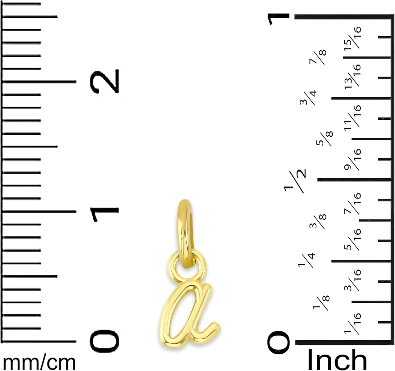 This solid 10k gold initial charm features a single letter design. The charm weighs 0.3 grams and has a height of approximately 5/16 inch (8 mm). Dimensions vary slightly by selected letter. It has a polished finish. The initial charm displays a chosen letter corresponding to a name or initial. It is commonly used in personalized jewelry, monogram accessories.. This 10k gold letter pendant uses gold sourced from authorized American distributors. Suitable for use as an initial necklace charm, letter pendant, monogram jewelry, or addition to collections of accessories. Review the product dimensions and listing photos before purchasing, as designs vary by letter selected. Chain or attachment not included.