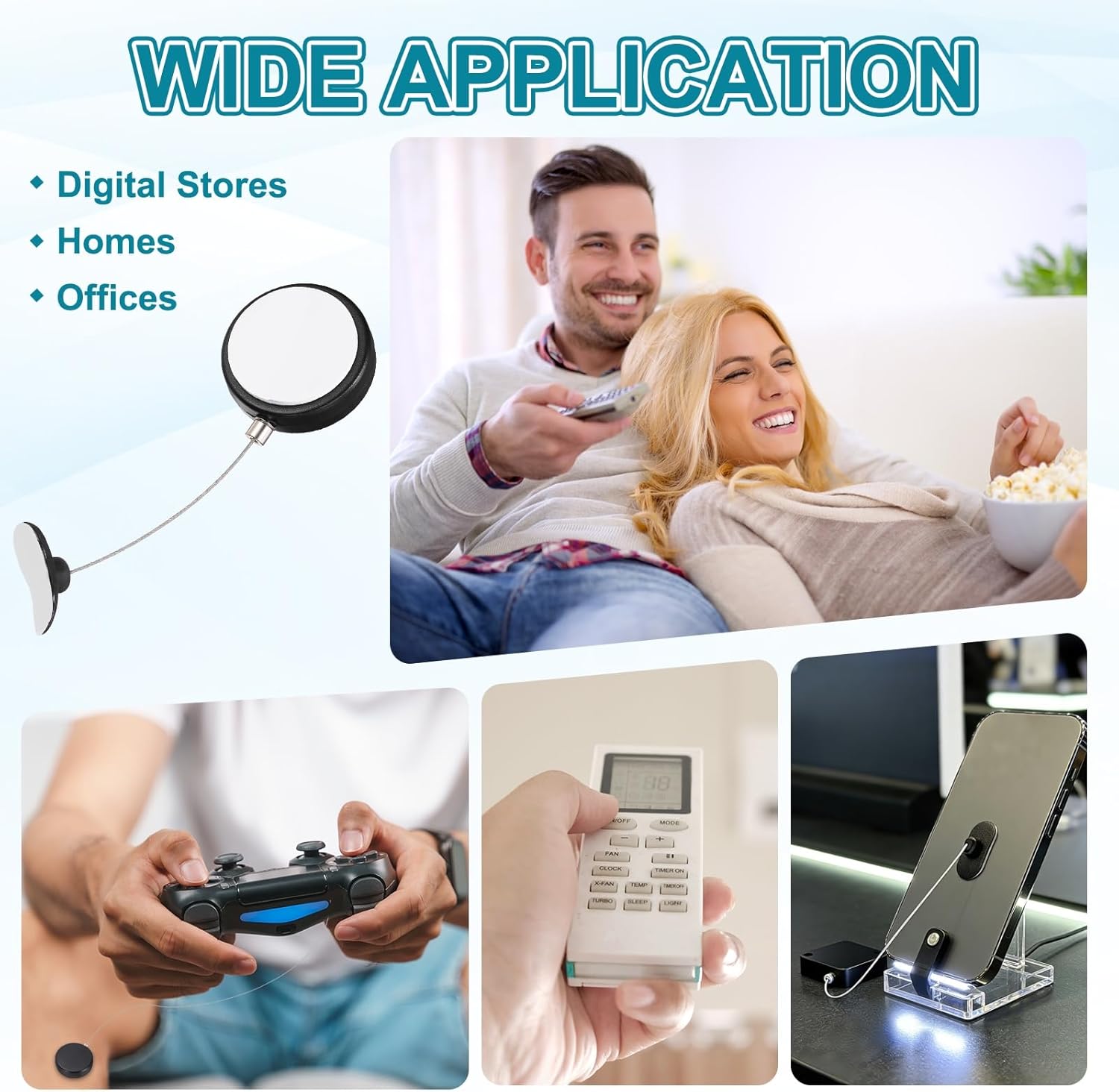 Reasons for selection:Our Remote Cable Lock has a base made of ABS, which is lightweight and impact-resistant, and a cable made of 304 stainless steel constructed from 49-strand steel wire, which is known for its corrosion resistance, tensile strength and durability—all combining to ensure the lock's long-lasting performance and reliable, secure use in diverse scenarios.Measurement:Steel Cable Extending up to 1.5 meter / 4.9ft / 59.1 inch; Base size: 41.5mm x 12.2mm/ 1.63 x 0.48 inch(D*H); Cable diameter: 0.9mm / 0.04 inch; Retraction Tension: 80–150 g (0.78–1.47 N); Color: Black; Package: 5 Pcs Pull Box, 5 Pcs 1.3mm Hex Key WrenchSuitable for:This retractable remote control cable tether is expertly designed to prevent theft of phones, tablets, TVs and other electronics in public or shared environments. It is widely applicable to diverse scenarios including retail displays, offices, homes, watch shops, 3D movie theaters, optical shops, jewelry stores, digital stores, large supermarkets.Installation:This retractable remote control cable tether features a adhesive patch for secure surface mounting and an adjustable copper column (using the included wrench to set device-to-base distance).Easy to use: adjust the strap loop size with the included wrench to fit your product and lock it in place, then attach the base—featuring a built-in adhesive patch on its back—to any flat surface to keep your product from getting lost.Kind tips:Ensure the mounting surface is clean and dry before application. After attaching the base, avoid pulling or stretching the tether for at least 3 hours to allow the adhesive to fully set and form a firm, long-lasting bond.