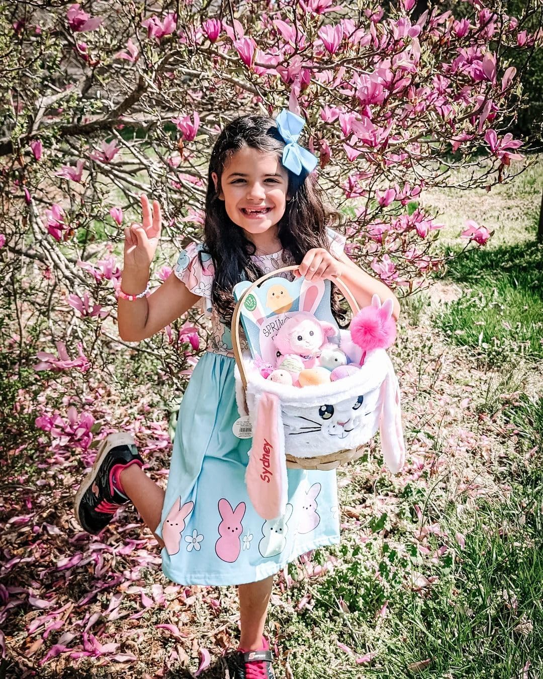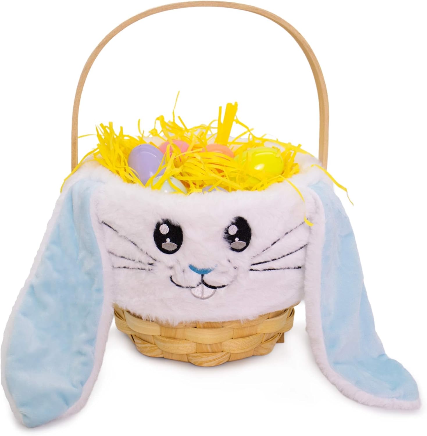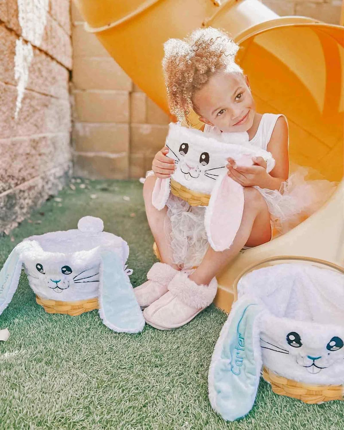 Easter is a great time to celebrate our blessings. And what wonderful blessings our little ones are. Gift your precious little one with our cute and fun Bunny Face Easter Basket. It is easy to carry and will hold all the Easter Eggs and goodies that they collects. Dibsies will personalize your Easter Basket FOR FREE!!! * Measurements: 9 1/2" Diameter opening, 11" Tall with Handle, 5.5" Tall without Handle * Basket features a drop down handle which makes it easy for storage. *Please note: Handle does not stand up on its own. *Handcrafted wicker woodchip is woven from premium quality wood. . *Includes personalization with up to 9 letters as shown in the picture.