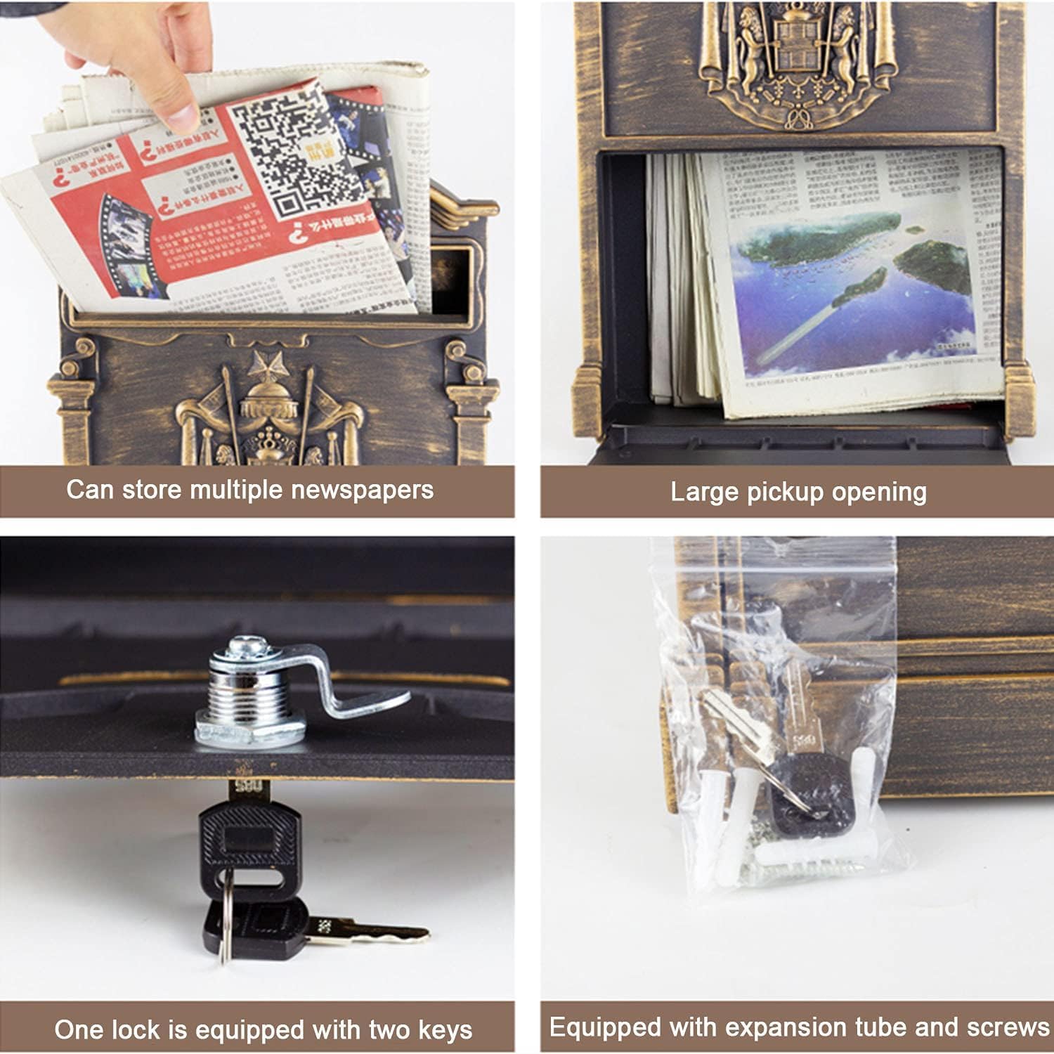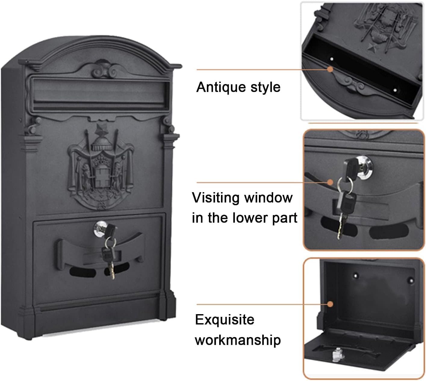 • 【Vintage Design】This wall mounted mailbox you can install outdoors. ​it can be used as a decorative item. The vintage look and delicate embossed design give it a unique aesthetic effect as a wall decoration too.