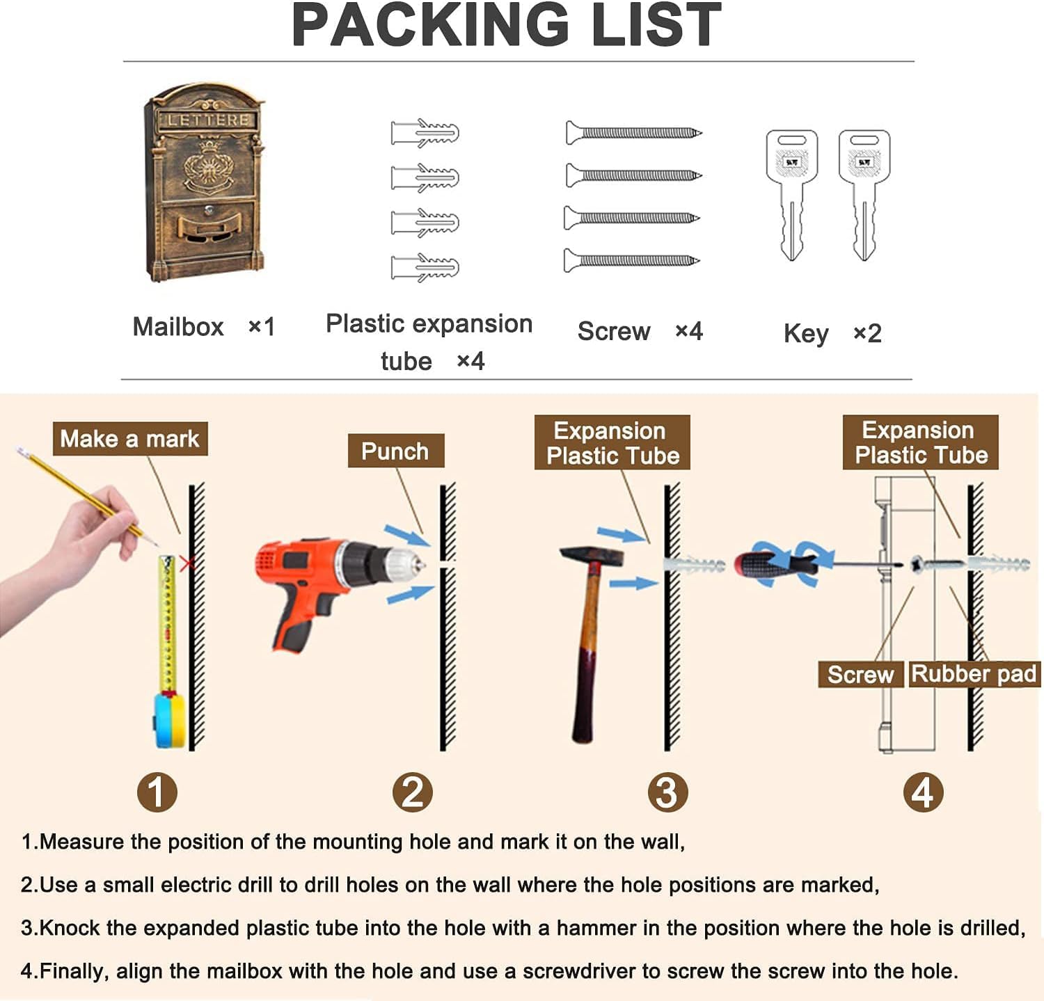 These retro letter boxes are perfect for residential locations. Complete with a lock and key, you can rest easy knowing that your mail is safe.Add to the look of your home with these beautiful and elegant vintage wall mounted mailboxes. Product Name: Wall mounted mailboxProduct material: Aluminum + zincColor: Coffee, Bronze, Brown, Black, Dark green, Blue, Light green, White, Red, Chauvin red, PurpleProduct size: 41x8.3x26cmProduct weight: 2.5kgChoose our Vintage Wall-Mounted Locking Mailbox for a secure, stylish, and durable solution to your mail collection needs. Its combination of robust construction, secure locking mechanism, and classic design makes it the perfect addition to any property.