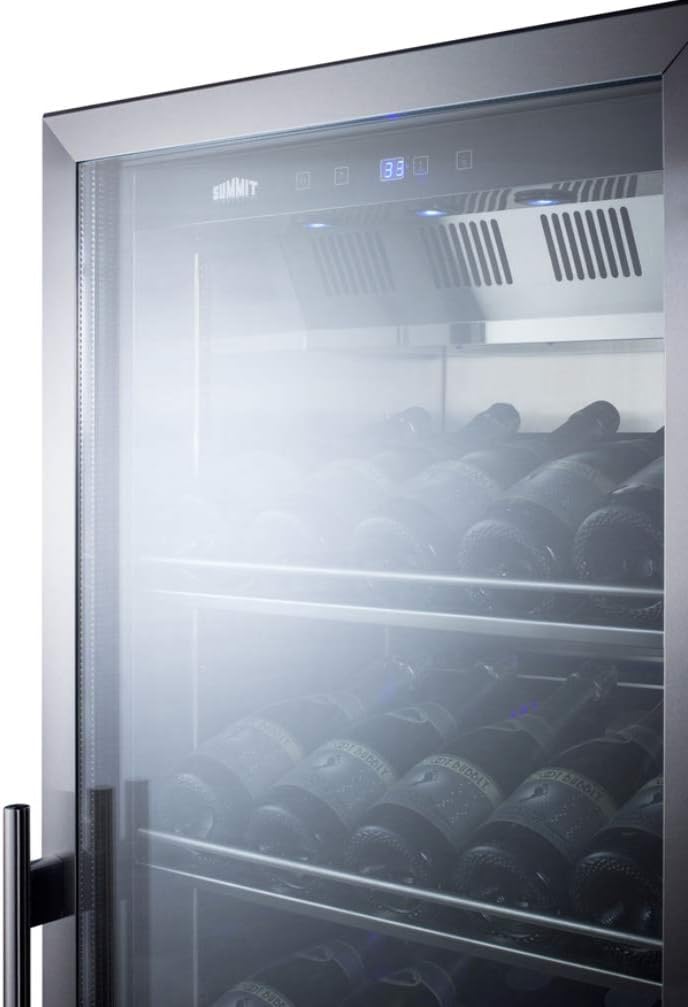 Summit Appliance SCR1401CHCSS Full-Size Commercially Listed Wine Cellar with Stainless Steel Interior, Champagne Shelving, Digital Controls, Self-Closing Glass Door, Lock and Stainless Steel Cabinet Key Features: - Design meets UL-471 commercial standards and is ETL-S listed to NSF-7 standards for commercial use - Stainless steel shelving is specially sized to store larger wine and champagne bottles, with adjustable clips prepositioned to display bottles at a slight angle - Digital thermostat offers precise and convenient temperature control with a wide range to accommodate red or white wine - Interior can be set between 36 to 68ºF, allowing users to adjust for red wine, white wine, or champagne - Fully lit interior with a striking blue LED hue, providing an attractive and energy efficient view - Factory installed lock offers additional security Specifications: - Height of Cabinet: 69.75" - Width: 23.63" - Depth: 23.75" - Depth with Handle: 25.63" - Depth with door at 90°: 46.75" - Capacity: 12.6 cu.ft. - Bottles: 35 - Defrost Type: Frost-Free - Door: Glass - Cabinet: Stainless Steel - US Electrical Safety: ETL - Canadian Electrical Safety: ETL-C - Sanitation: ETL-S - Amps: 1.7 - Voltage/Frequency: 115V AC/60Hz - Weight: 250 lbs. - Number of Zones: 1 - Door Swing: RHD - Shelf Type: Steel - Shelf Qty: 6 - Interior Light: Yes - Fan Type: Interior - Refrigerant Type: R600a - Refrigerant Amount: 1.76oz. - High Side PSI: 270 - Low Side PSI: 105 - Temperature Range: 36 to 68ºF - Interior: 59.75"x20"x16.5" - Compressor Step: 4.5"x20"x4.5"
