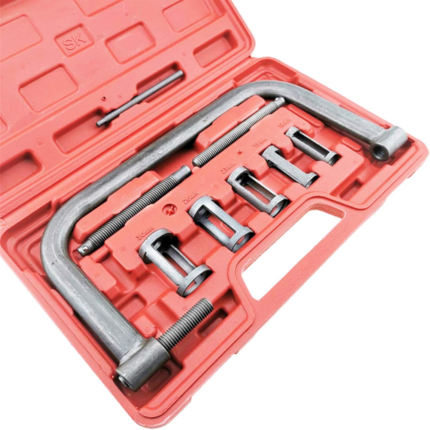 A valve spring compressor is specially designed to help remove and compress valve spring convenient and . The professional valve spring compressor is an useful for use on most car, small van and motorcycle engines. Specifications: Material: Steel Each Adaptor Length: 47mm / 1.8" ""C"" Clamp Size: 190 * 160mm / 7.5 * 6.3" Extension Screws Size: 113mm / 4.4", 113mm / 4.4", 70mm / 2.7" Compression Bar Size: 100mm / 3.9" Storage Case Size: 320 * 200 * 40mm / 12.6 * 7.8 * 1.5" Fitment: For most car, small van, motorcycle engines Package Weight: 1160g / 40.92ounces Package Size: 320 * 200 * 40mm / 12.6 * 7.87 * 1.57in Packing List: 1 * Spring Compressor ""C"" Clamp 5 * Adaptors 3 * Extension Screws 1 * Compression Bar 1 * Storage Box