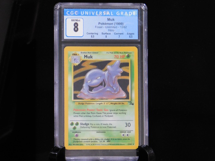 A classic for Pokémon fans! This is a CGC Graded 8, 1999 Muk #13/62 Pokémon Fossil Unlimited Holo. The "Fossil" set is cherished among collectors for its early print run and iconic cards like Aerodactyl. Muk's Holo status and Toxic Gas power made it a notable card in early decks. This is your chance to add an early Pokémon favorite to your collection today.