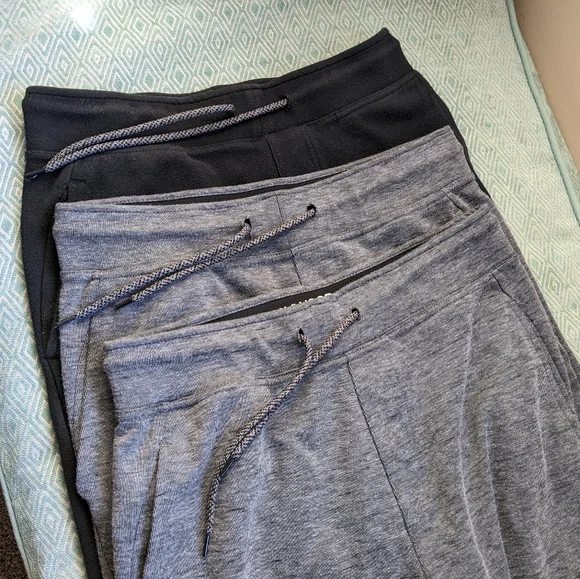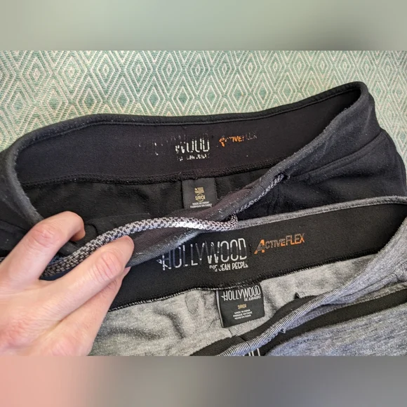 Men's Hollywood The Jeans People Active Flex Joggers 3 Pairs, 2 gray and 1 black. These aren't your ordinary oversized jogger pants, these bring a stylish closer fit and appearance to your casual outfit helping to achieve a more pulled together look. All joggers are in good used condition, slight pilling is more apparent on the black pair (see listing photos).The fit is slightly longer on the two gray pairs than the black, the style is slightly shorter. All three joggers feature a drawstring waist, with tapered legs and a zipper ankle feature! This was a must have for larger feet! It is so helpful to unzip the ankle when putting the joggers on and zip it up for a polished finish!New to ? Use my referral code KALLIE_CHICwhen you sign up and you'll get a $10 discount on your first purchase over $10 from !