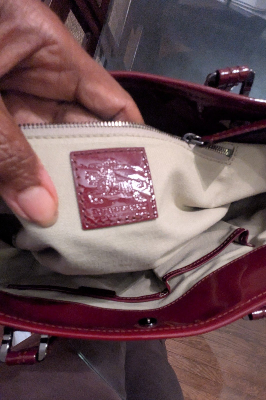 The Interior has a zipper pocket along with the Burberry plaque in red patent leather, with a cloth lining. Very clean, no stains or rips. The measurements are 16.75"W x 8.4"H x 5.5"D.