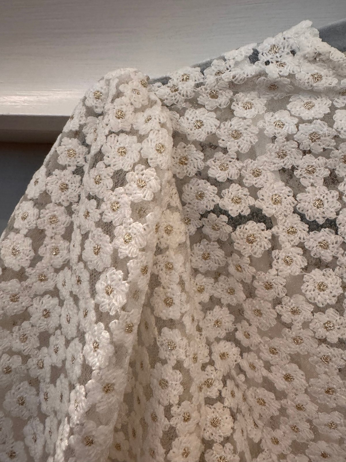 Gracia White Blouse. Size S. In excellent like new condition. Features: short sleeve puff sleeve, floral adorned, sheer with white camisole, and zipper back closure. Great looking with jeans or other kinds of bottoms. Perfect for any occasion. Made of 100% polyester. Has slight fragrance smell.