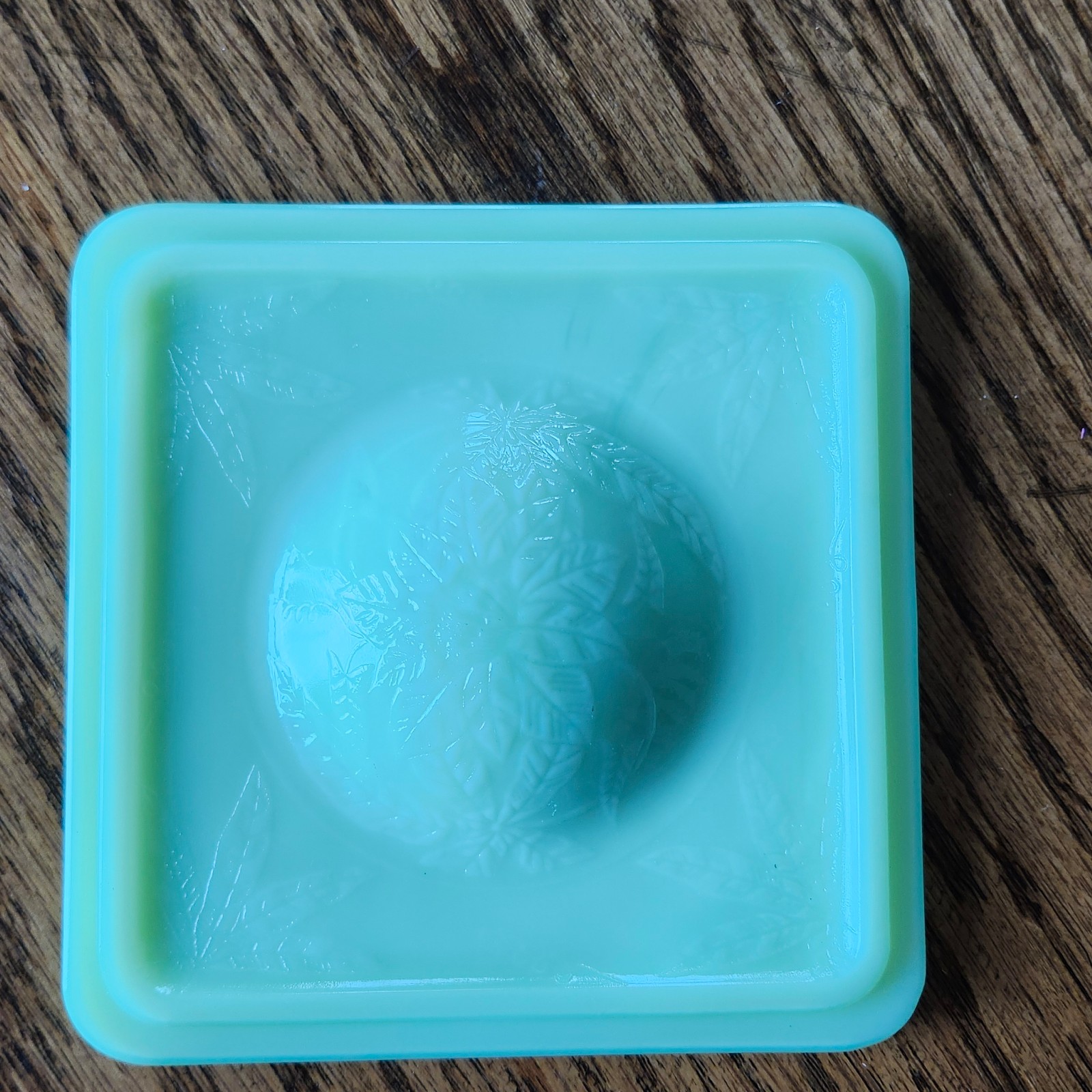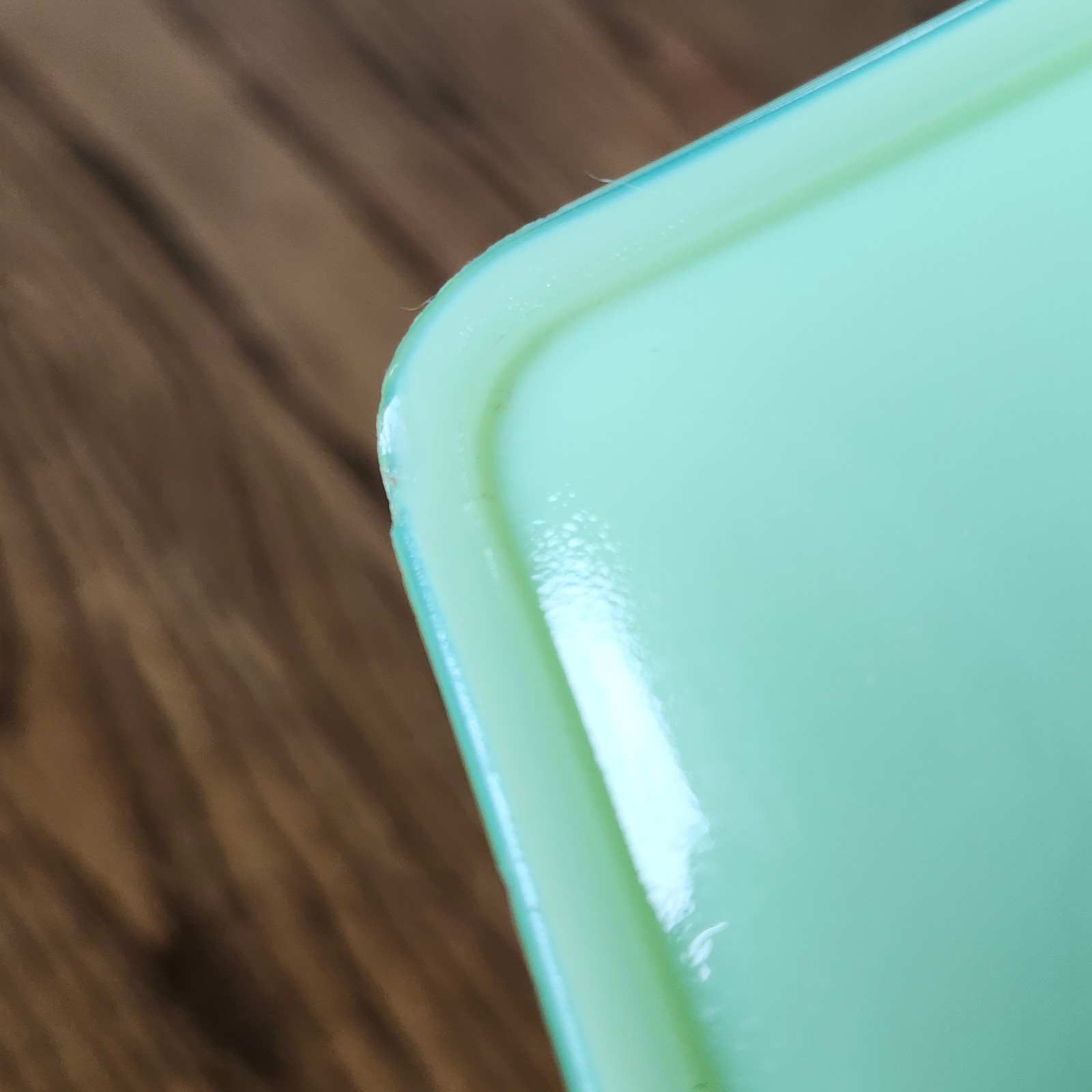 Jeannette Jadeite 48oz cereal canister. There are some chips on the canister and one the rims. There are swirls to the glass. Please see the photos for condition.