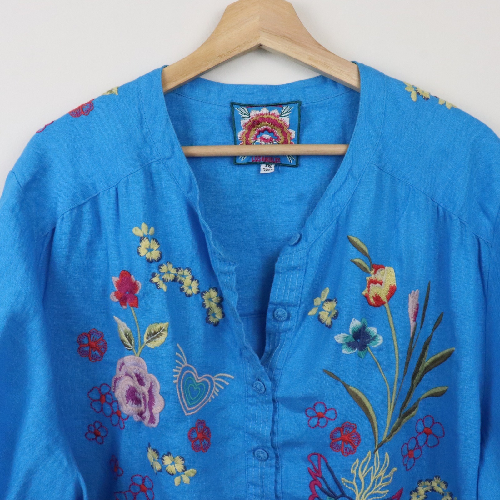 Johnny Was Jessi Shirred Yoke Blouse Linen Embroidered Floral Bird Shirt in Blue. Size XXL.