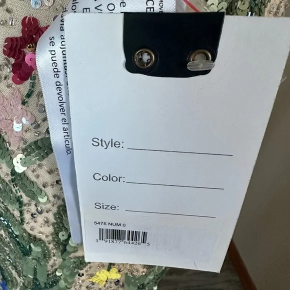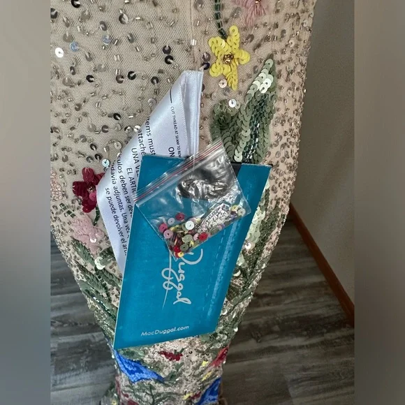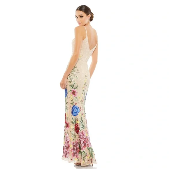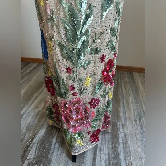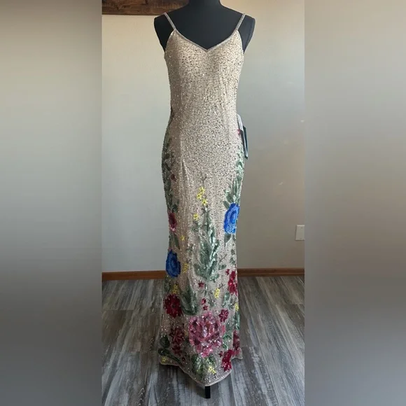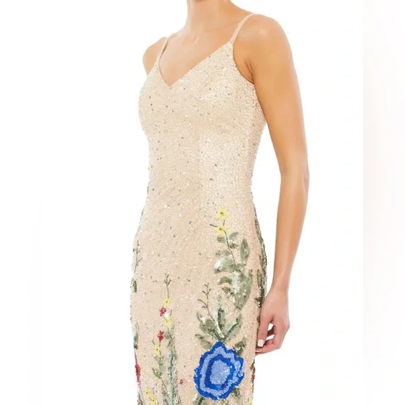 FLORAL EMBELLISHED SPAGHETTI STRAP GOWNNude/Multi Floral Size 0This gorgeous gown is decked from top to tip in twinkling hand-applied sequins. Cut with a V-neckline and spaghetti straps, the floor-length dress opens with an all-black bodice and introduces color at the gently flared hem in the form of climbing embellished flowers.Mac DuggalEmbellished mesh fabric with solid lining (100% polyester)Fully linedV-necklineBeaded spaghetti strapsConcealed back zipperApprox. 62.5" from top of shoulder to front skirt hemStyle #5475$598 - sold out online**Missing a few beads on strap** see photos