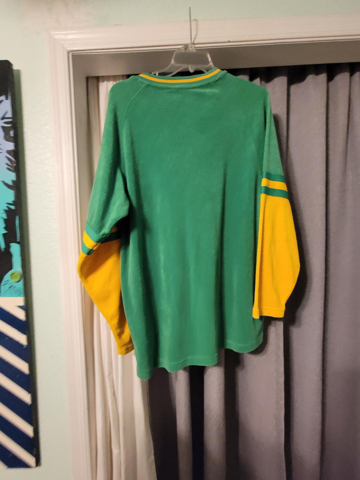 The is a vintage Nike MLB Cooperstown Collection Oakland Athletics fleec/terrycloth sweatshirt in size L for men. It features the team's official colors of green and yellow and is officially licensed by Major League Baseball. The sweatshirt is perfect for fans of the Oakland Athletics and baseball enthusiasts alike, making it a must-have for any fan apparel collection. Made in Korea, this 90's sweatshirt is a unique and stylish way to show support for your favorite team during the regular season. Fantastic condition