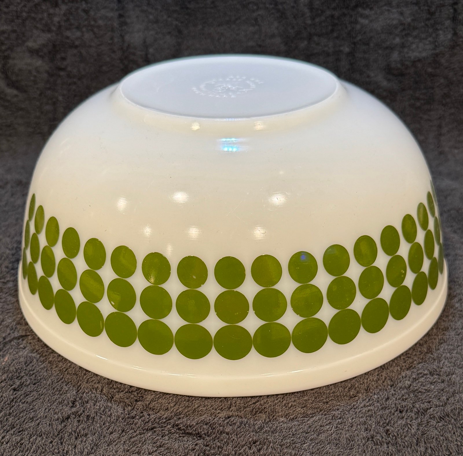 This vintage PYREX mixing bowl is a beautiful addition to any kitchen. The green polka dot pattern is eye-catching and unique, making it a great decorative piece. The bowl is made of durable milk glass and can be used for baking, serving, and entertaining.