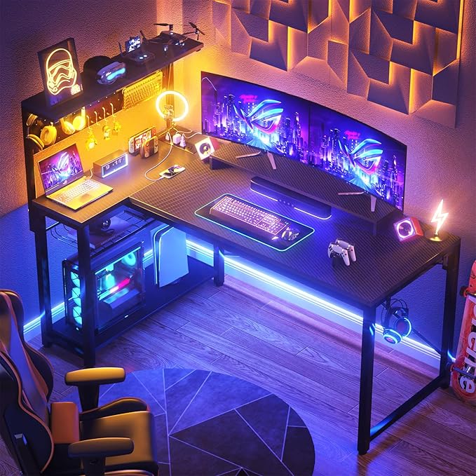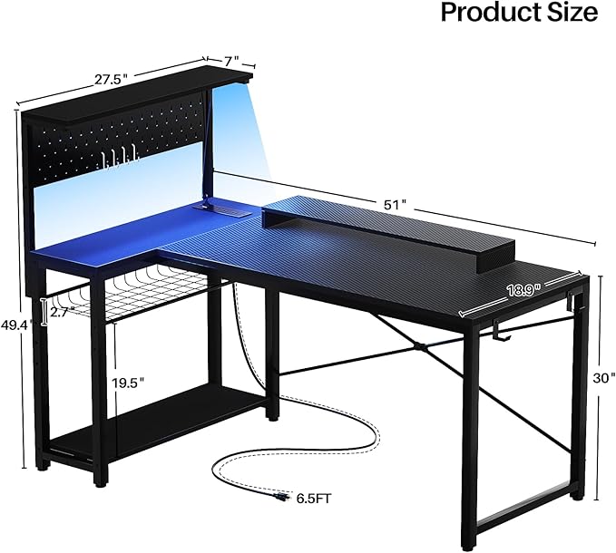 Small Gaming Desk With Power Outlets Pegboard Led Light, 51 H L Shaped Computer Desk With Monitor Stand Storage Shelves, Reversible Corner Desk With Headset Hooks, Carbon Fiber Black