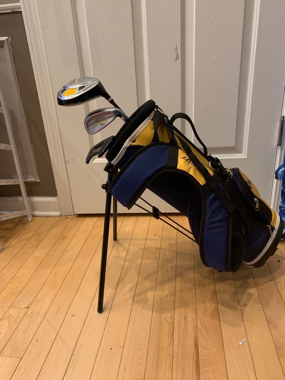 Top flite XL junior starter golf set. Includes a driver, 9 iron and putter. As well as a golf bag with carrying handle and legs to keep it upright.