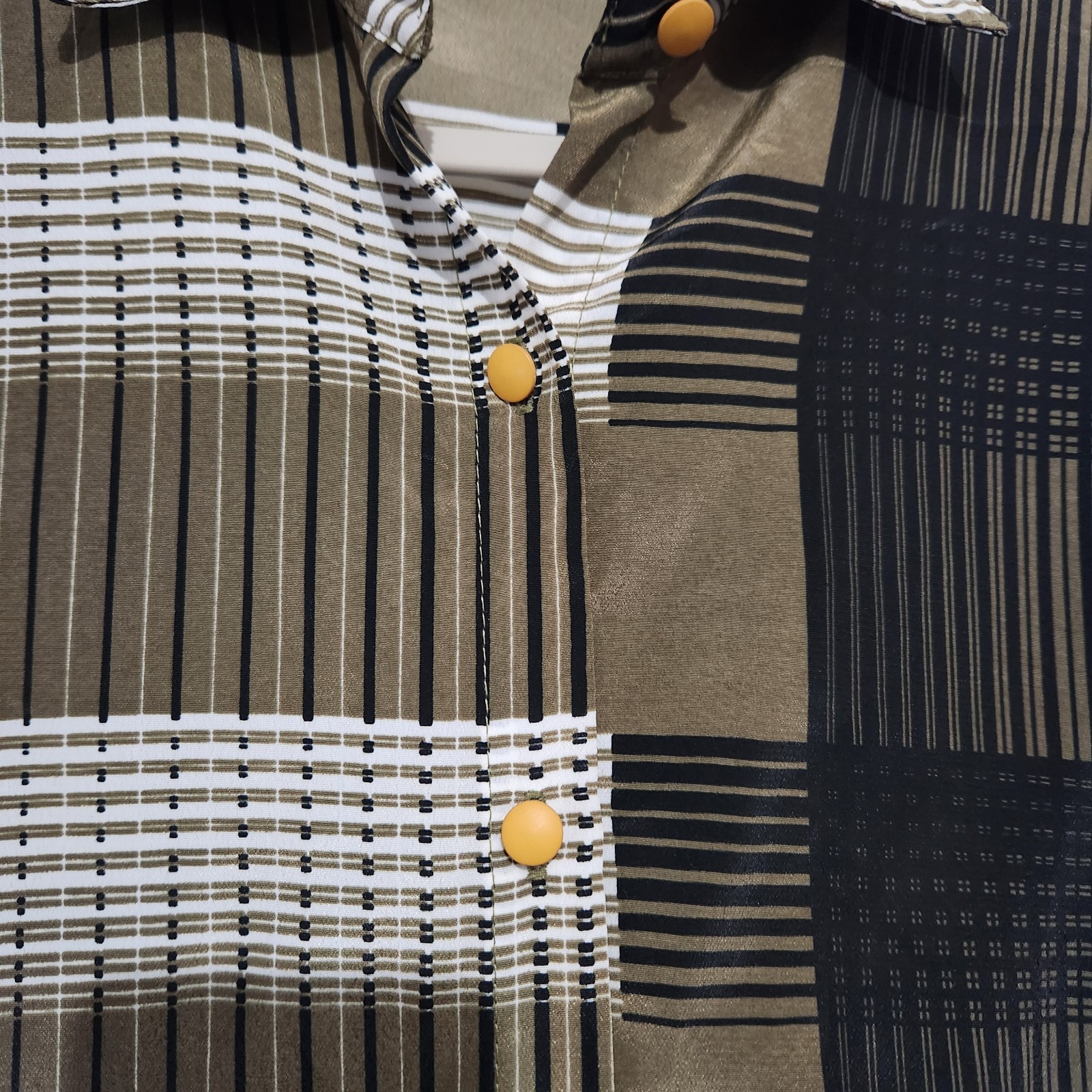 Features a unique geometric, colorblock pattern. Fabric is very soft, almost a brushed-suede feel. Mustard tone buttons. Perfect 80s/90s retro style.