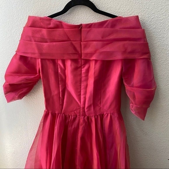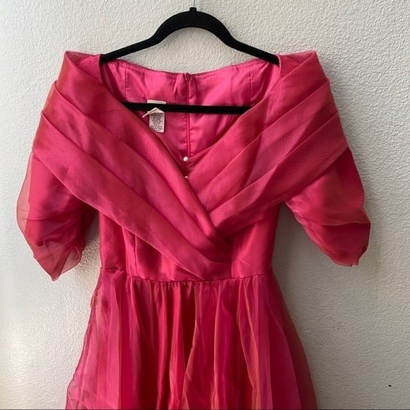Fully lined, full skirt, princess neckline. Zip closure in back.