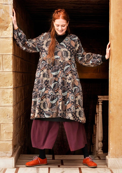 Digitally printed dress in an exciting style. Constructed in diagonally cut panels, with the fabric direction placed on an angle. V-neck and long puff sleeves with elastic at the cuffs. Pockets at the side seams.