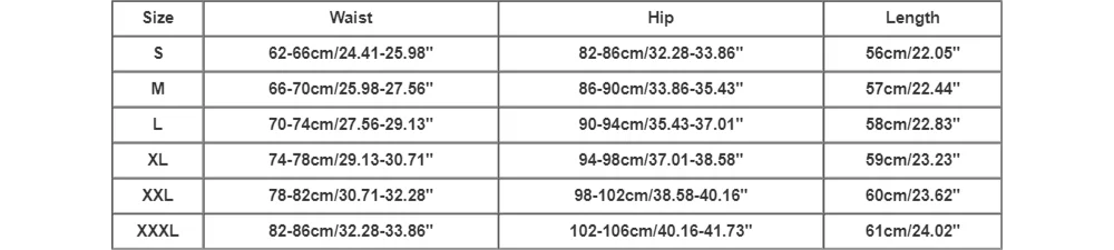 | Size:XXXL | Waist:82-86cm/32.28-33.86'' | Hip:102-106cm/40.16-41.73'' | Length:61cm/24.02'' |