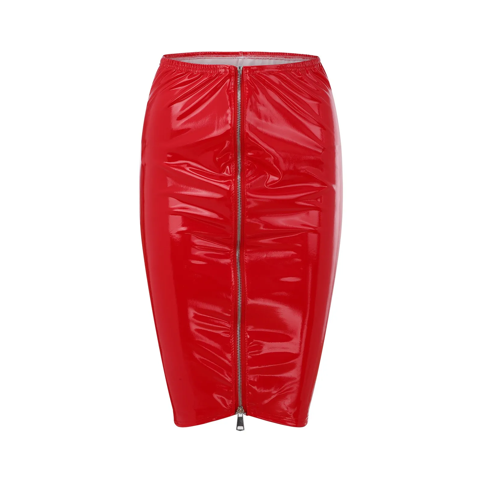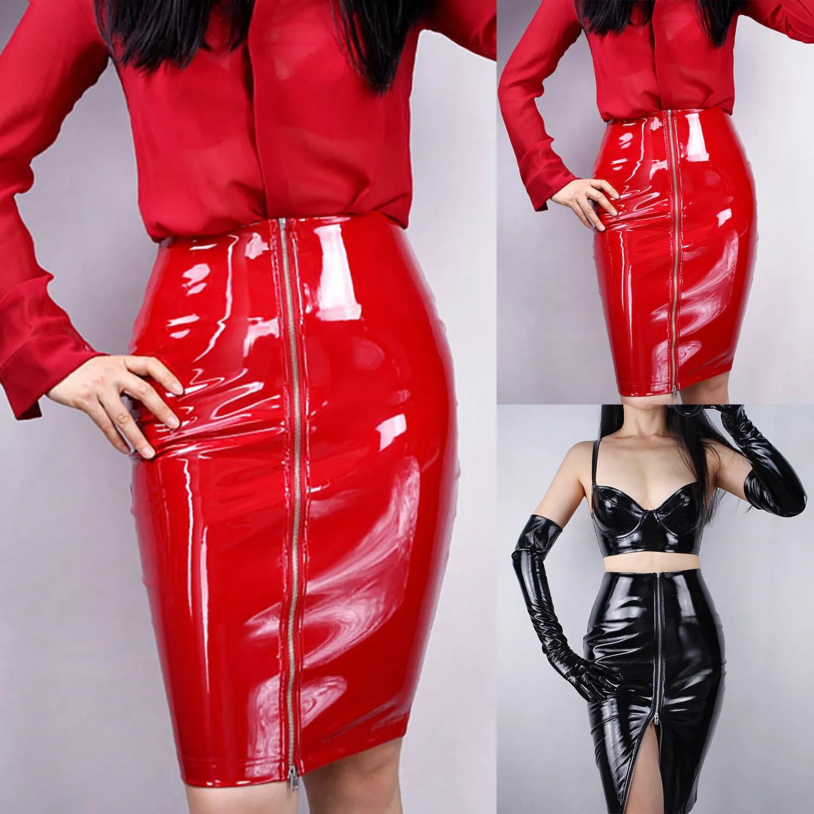 Features: faux leather, high waist, full zipper front, split hem, mini length, slim fit, gives you a great curvy fit over your sleek shape